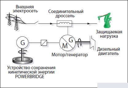 Он работает по тому же примерно принципу, что и классические системы бесперебойного питания – при кратковременных сбоях или некачественном питании (неправильная синусоида переменного напряжения, колебания частоты, амплитуды и т.д.) используется накопленная кинетическая энергия, при долговременных пропаданиях электроэнергии включается дизель-генератор. Благодаря «волчку» переключение питания происходит очень быстро и незаметно для потребителей, то есть без прыжков напряжения, например.