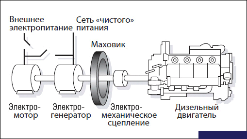Самой интересной технологией с точки зрения экономической обоснованности оказалось ДДИБП — дизель-динамический источник бесперебойного питания. Его основной принцип в том, что он накапливает кинетическую, а не химическую энергию, как обычные системы ИБП на батареях.