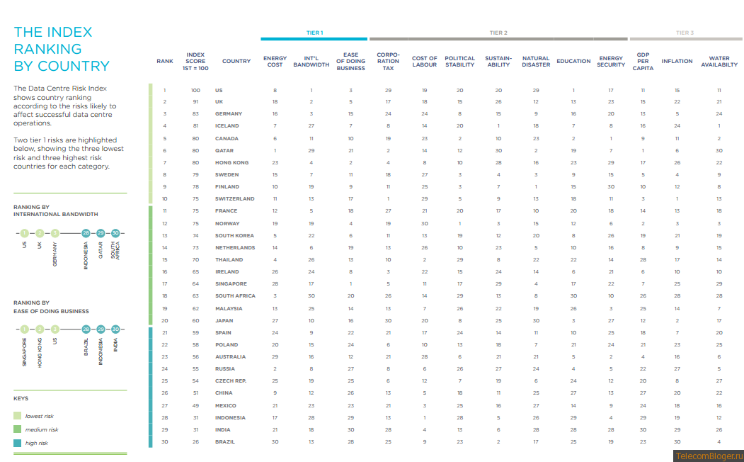 Россия со свои обилием водных ресурсов, наличием резервов по энергетики и ее относительно низкой стоимостью в сочетании с низким индексом простоты ведения бизнеса, политической нестабильностью и высокой инфляцией, занимает 24 место и находится в зоне с высокими рисками для строительства ЦОД.