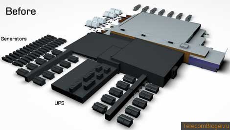 На иллюстрации видны изменения проекта дата-центра компании eBay в штате Юта. На верхнем изображении — первоначальный дизайн с ИБП и генераторами, ниже — усовершенствованный вариант с использованием только топливных элементов компании Bloom Energy.