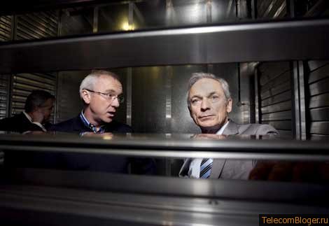 Представитель Google Пол Данн (Paul Dunne) (на фото слева) и Ричард Брутон (Richard Bruton), глава министерства вакансий, предпринимательства и инноваций Ирландии (на фото справа), осматривают систему воздушного охлаждения в новом дата-центре компании Google в Дублине. (Фото: Google).