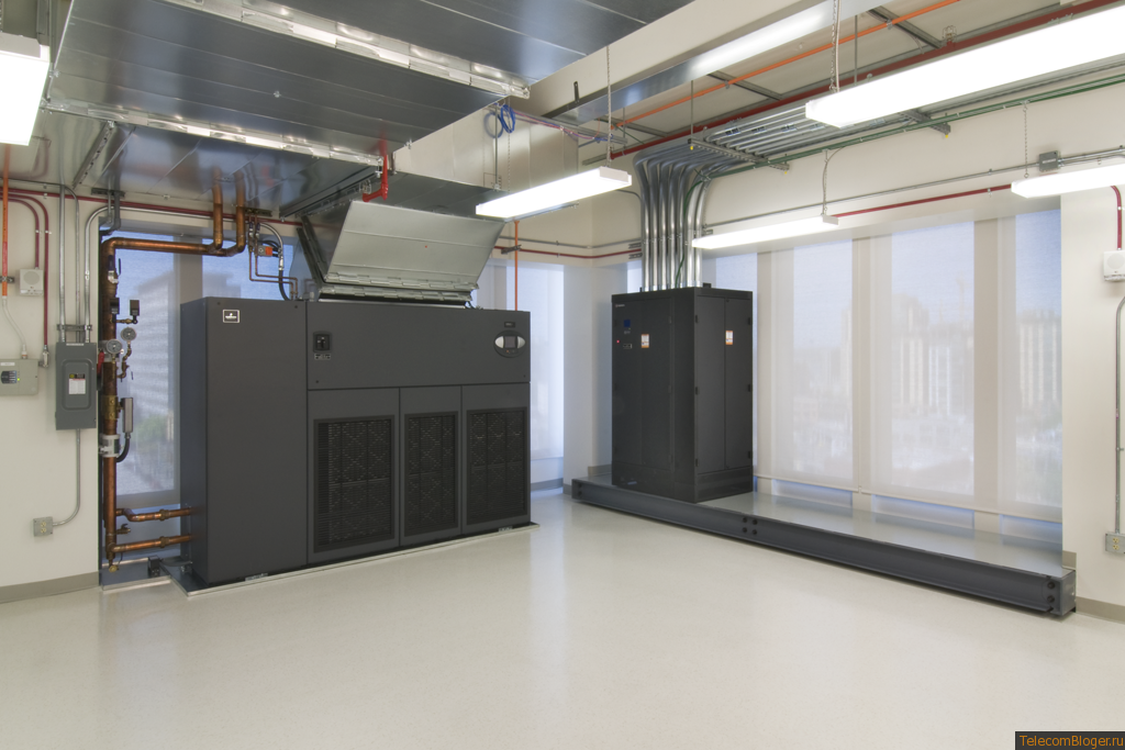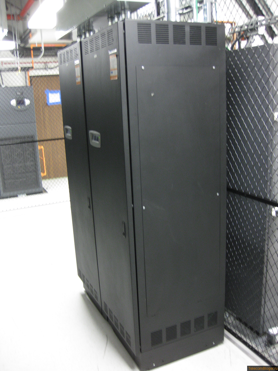 От этих распределительных щитов типа RPP к каждому щиту подводится по одному трехфазному каналу на 30 ампер и 208 вольт от основной и резервной шины электроснабжения. Планирование мощности проводится с допущением, что возможен отказ основной либо дополнительной шины электроснабжения, но при этом все оборудование будет плавно переведено на все еще функционирующий канал без каких-либо последствий.