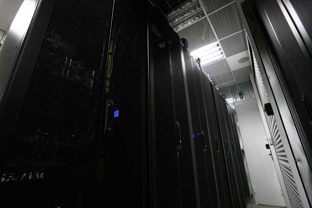 Серверные стойки. За перфорированным фальш-потолком — коммуникации и инженерные системы.