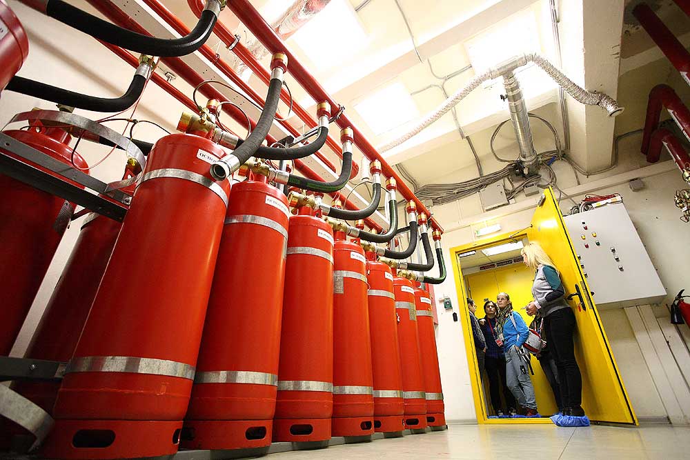 Установка пожаротушения состоит из модуля с огнетушащим веществом (Хладон-125). 18 баллонов и управляющее оборудование размещены в выделенном помещении. Их резервирование — по схеме «2N» — то есть в два раза больше, чем необходимо по расчетам (и больше, чем требуется по стандарту Tier III). Из этого помещения сделана трубопроводная разводка по всем помещениям ЦОД.