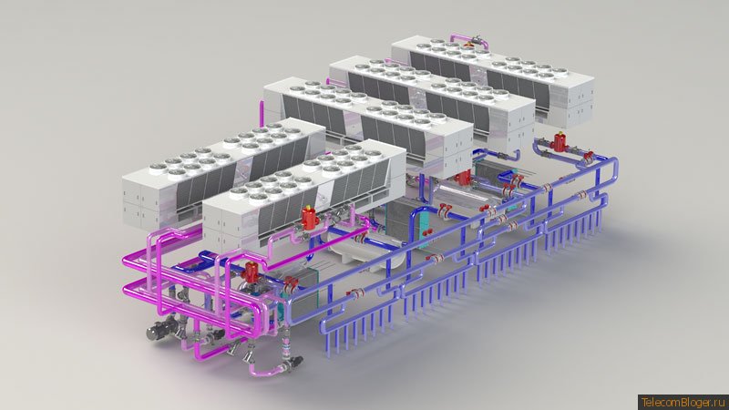 По PUE пока рано давать реальные данные. Компрессоры — Турбокоры. Кондеры — двухконтурные, один только на фрикулинг, через драйкулеры, вторые трубы — в реку с низкой температурой круглогодично, или в обход на чиллеры (это данные — для обхода, конечно, не для речки)