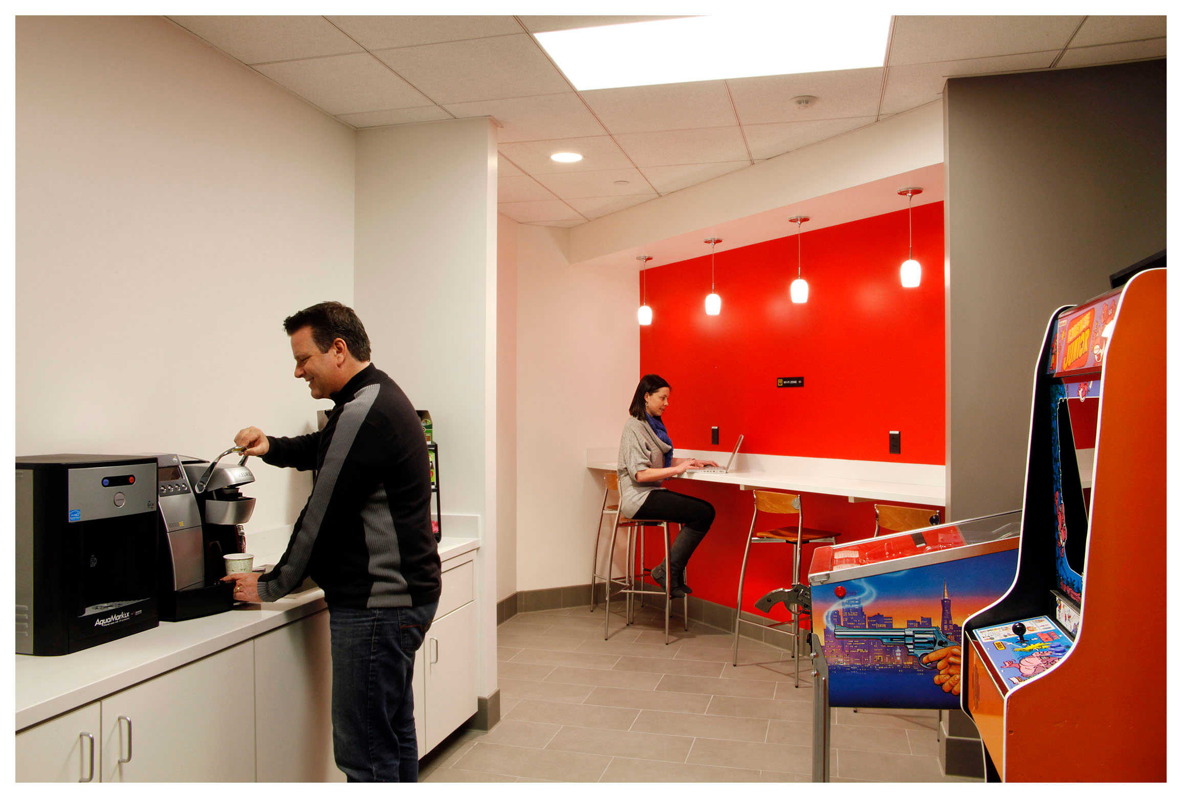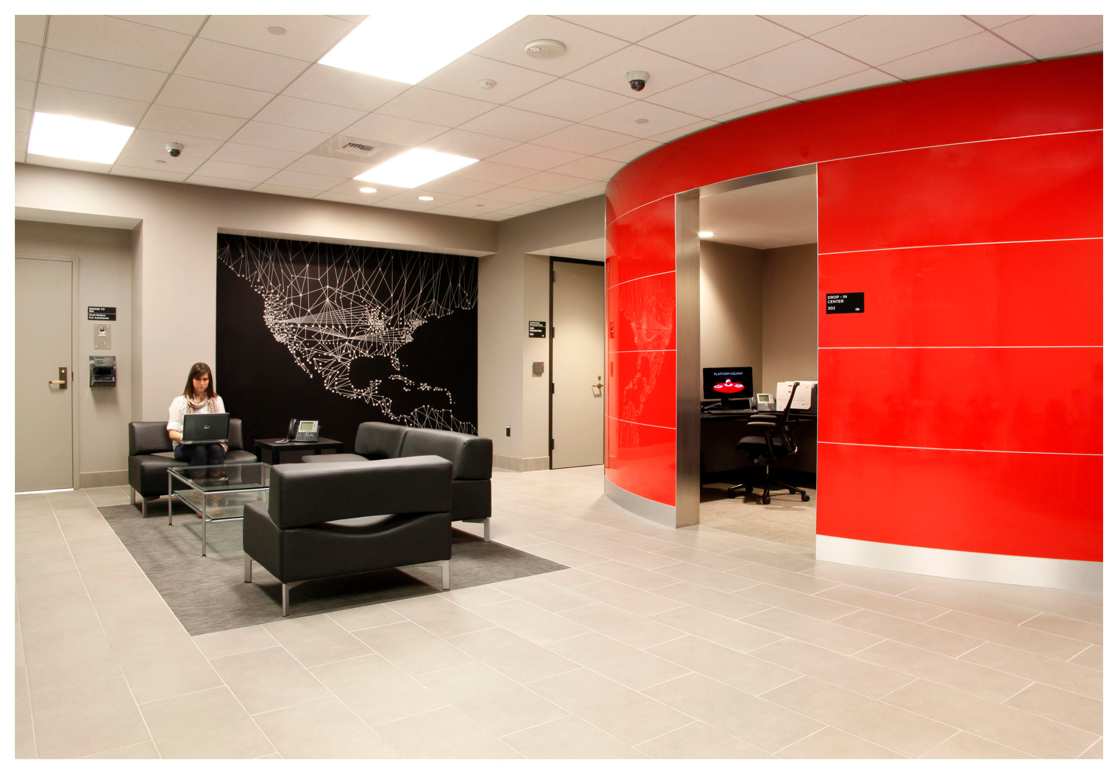 После прохождения поста охраны — но еще до входа непосредственно в машзалы — взору посетителей открывается холл, где специалисты могут расслабиться после напряженного трудового дня, которые они провели, обслуживая серверы. Из холла по застекленному коридору вы попадаете к очередному элементу системы безопасности, за которым скрывается большой грузовой лифт. Этот лифт доставит вас в самый центр ЦОД.