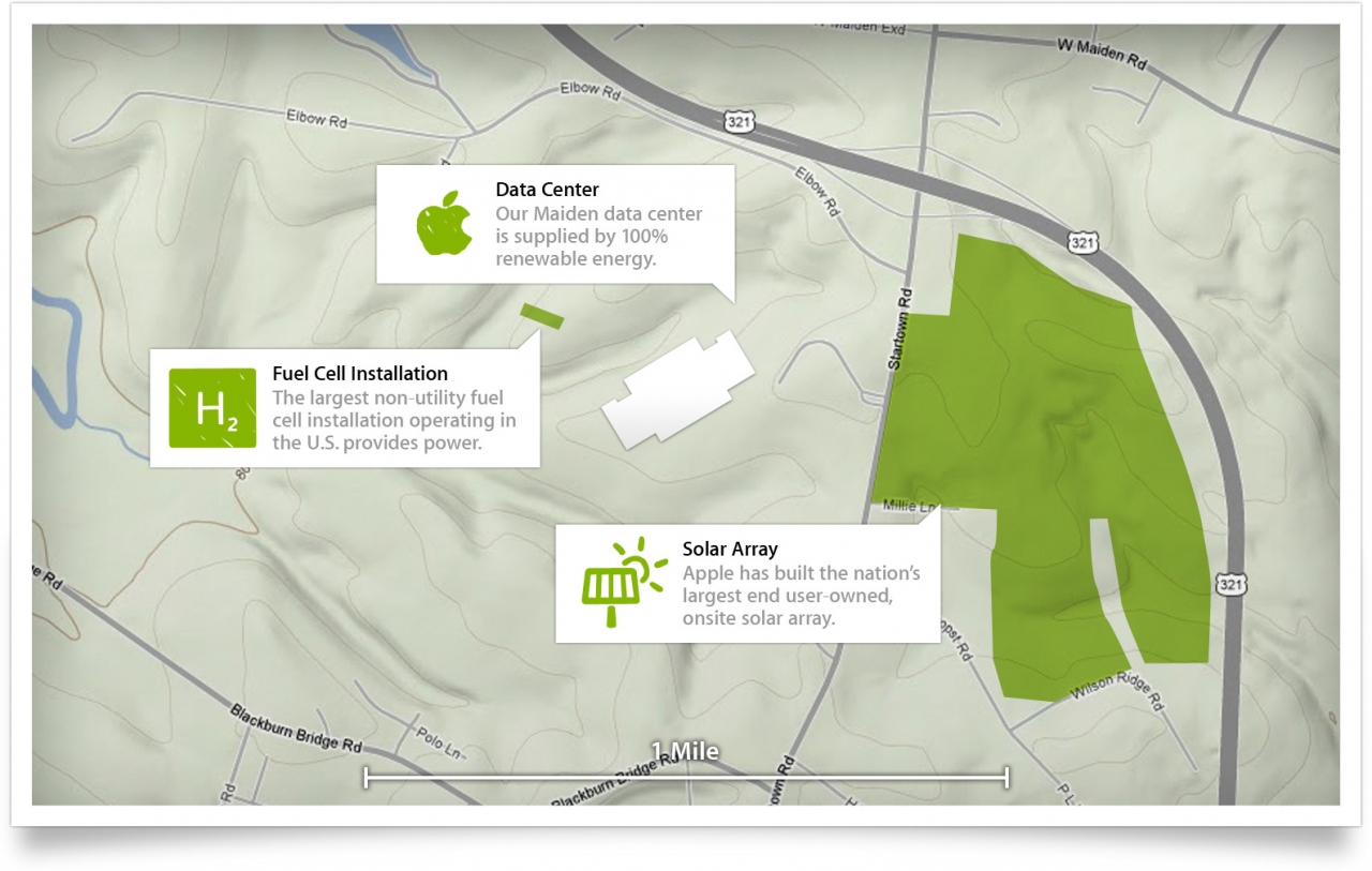 Первоначально планировалось выкупить здание текстильной фабрики, но его площадей по меркам компании оказалось недостаточно для дата-центра даже на непродолжительное время. Власти городка Мейден, дабы не терять инвестора, предложили большой участок земли всего в пяти километрах от этого места. В 2009 году недалеко от трассы № 321 была приобретена площадка 1 032 000 кв. метров, за которую Apple заплатила $3,5 млн. Интересный факт: часть земли пришлось приобрести у семейной пары, и 4 000 кв. метров частных владений были куплены у них за рекордные $ 1,7 млн. Торги длились достаточно долго, эта сделка получила большую огласку, а в прессе ее назвали «золотым акром». Семья, которая 43 года назад купила эту землю всего за $6000, после сделки с представителями Apple на вырученные деньги приобрела 200 000 кв. метров земли и построила роскошный дом. Вот что значит удачно расположить свой дом около центральной транспортной магистрали!