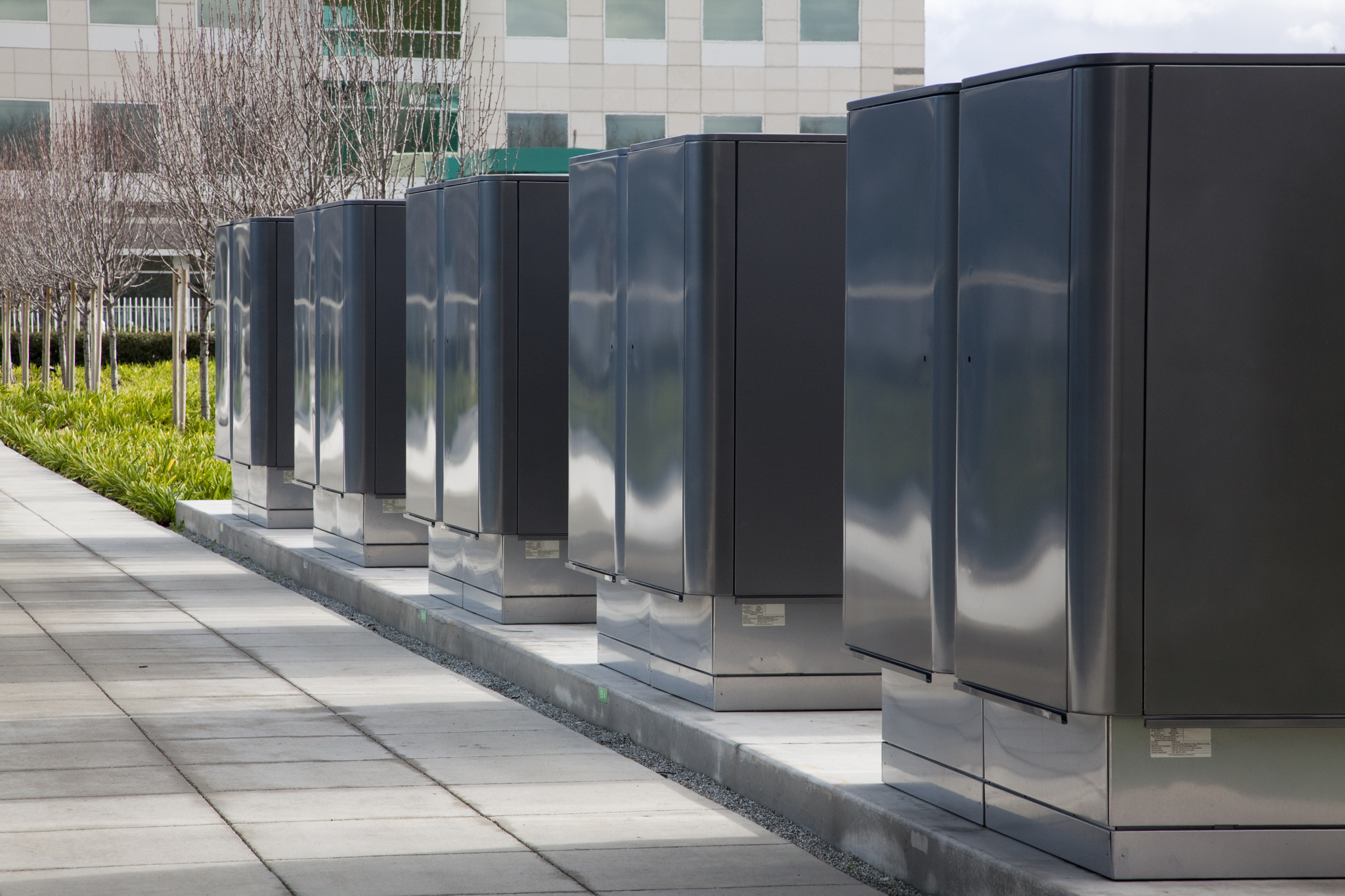 Символично, что дата-центр получил букву «i» (как и большинство продуктов Apple) и стал называться iDataCenter . Очереди возводятся по типовому проекту, поэтому дата-центры имеют зеркальные планировки. Площадь каждого здания — около 48 000 кв. метров (Кстати, в переводных русскоязычных материалах достаточно часто вместо квадратных футов фигурировали метры, из-за чего в прессе возник курьез: дата-центр называли чуть ли не самым большим в мире ), полная проектная мощность дата-центра — 20 МВт. Предполагается возможность расширения дата-центра с помощью модульных контейнерных ЦОД вблизи от здания производства NxGen. Рядом с этой площадкой — два массива солнечных батарей общей мощностью 20 МВт (фото 3). Второй источник электроснабжения, который также используется для данного дата-центра, — электростанция, работающая на биогазе. Его получают от разложения биомассы, которая берется с ближайшей свалки. Производимый из биогаза метан проходит очистку и аккумулируется. Мощность электростанции составляет 5 МВт. Технология не нова, но здесь и не используется привычный принцип когенерационной установки для выработки электроэнергии — она получается химическим путем: путем окисления метана в твердооксидных топливных элементах Bloom Box Energy Server (фото 4). Но это не финальные цифры: планируется увеличение мощности обоих источников до 40 МВт (фото 5).