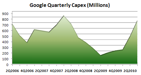 По сообщению Google, в третьем квартале 2010 года капитальные затраты (CapEx) компании в Центры Обработки Данных (ЦОД) достигли $ 757 млн. и стали вторыми самыми высоким ежеквартальными затратами в истории компании. На первой позиции остаются затраты первого квартала 2008, когда Google одновременно строил три Дата-Центра в США.