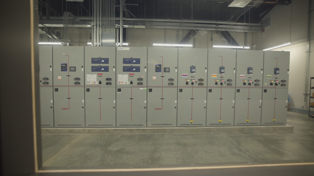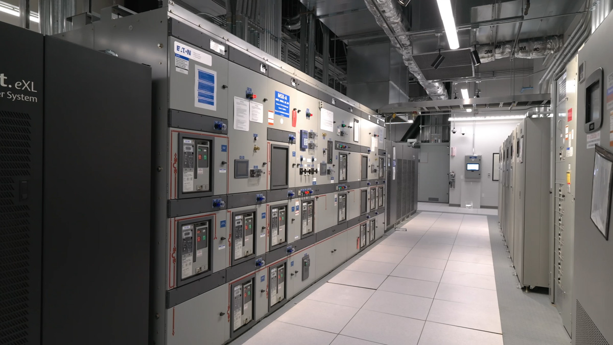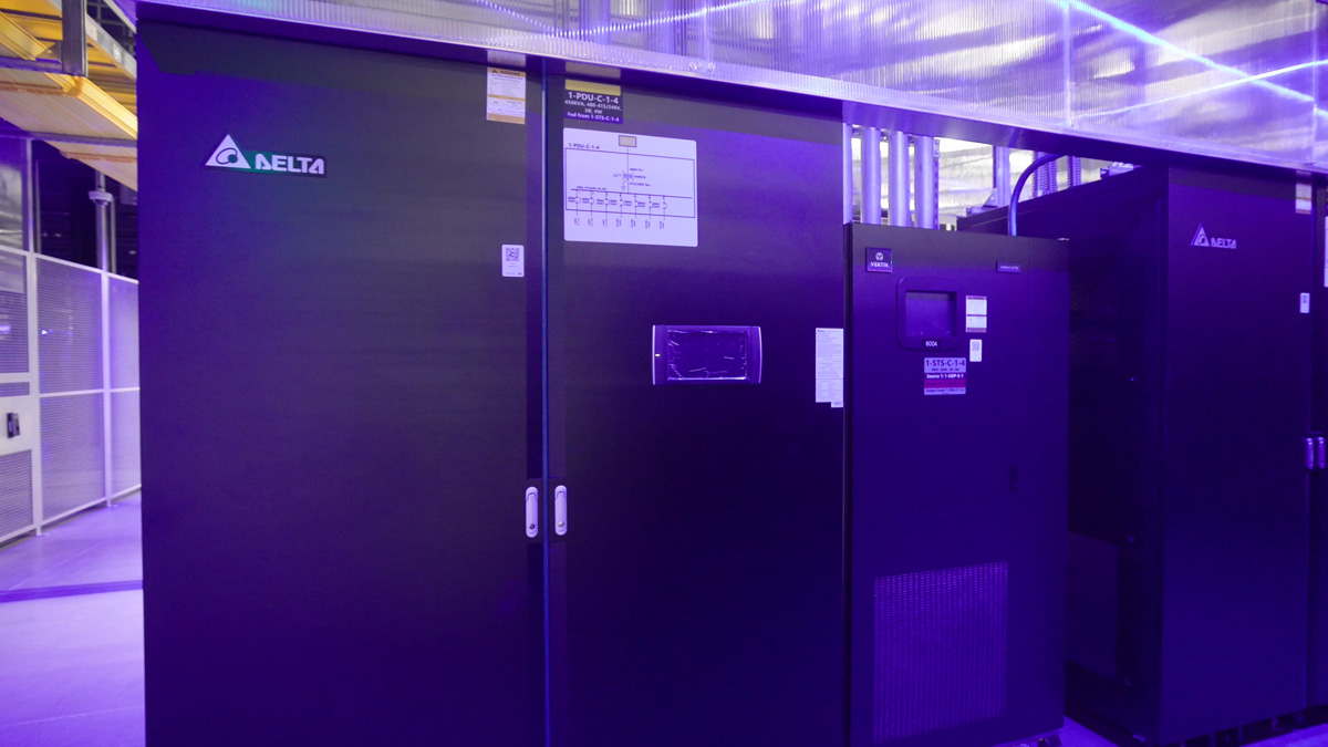 Электроснабжение кампуса организовано через многоуровневую схему. Электричество поступает на площадку извне по сети с напряжением на уровне 21,6 кВ, затем понижается до 480 В и далее — до значений, используемых на уровне стоек (415 В или 240 В). Локальные преобразования в стойках обеспечивают оборудование постоянным током.
