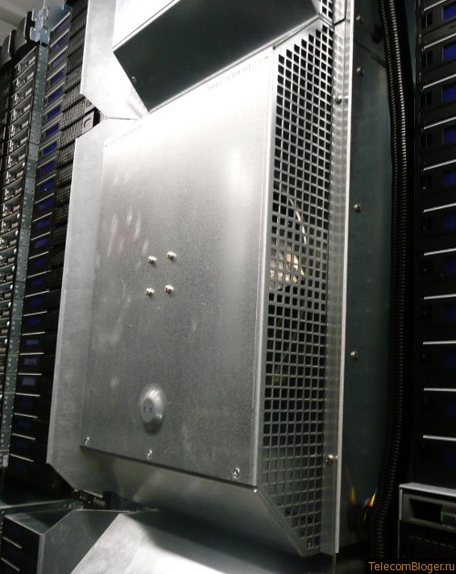 Радиаторы, находящиеся под металлическим кожухом, расположены между каждой сервером стойкой и подают холодный воздух к серверам. Нагретый воздух из горячего коридора охлаждается и снова подается в систему охлаждения.