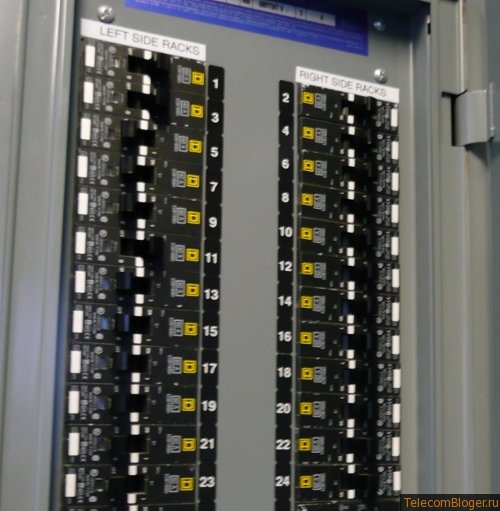 Панель управления питанием ЦОД, разделена на левую и правую часть с отдельным автоматом на каждую стойку.