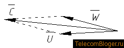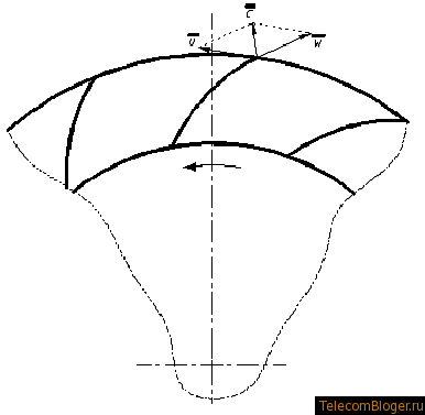 Рис. 3.5. Треугольник скоростей у вентилятора с загнутыми назад лопатками (w — относи-тельная скорость, u – окружная, c – абсолютная).