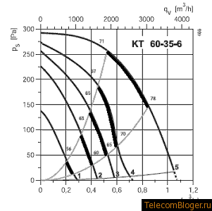 Характеристика вентилятора с загнутыми вперед лопатками выглядит следующим образом: