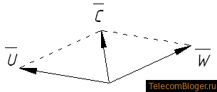 Рис. 2. Треугольник скоростей у вентилятора с загнутыми вперёд лопатками (w — относительная скорость, u – окружная, c – абсолютная).
