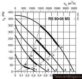 Рис. 3. Характеристика вентилятора с загнутыми вперед лопатками.