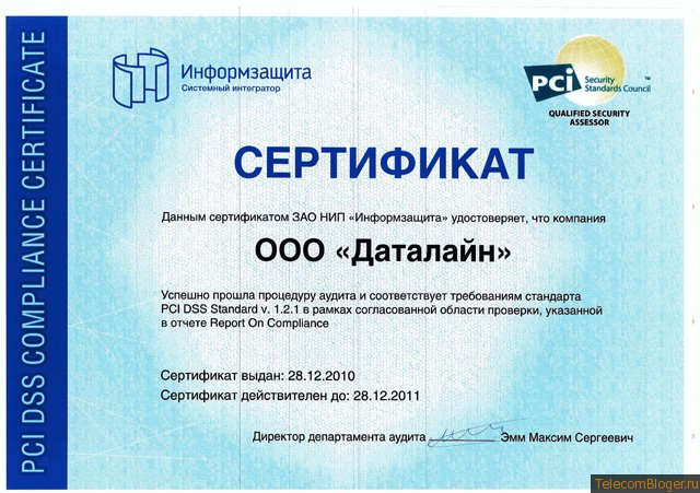 По результатам аудита, проведенного НИП «Информзащита», по состоянию на 28 декабря 2010 г. «ДатаЛайн» полностью соответствует требованиям стандарта PCI DSS. Необходимые отчетные документы направлены аудитором в платежные системы Visa, MasterCard Worldwide, сообщили в компании.