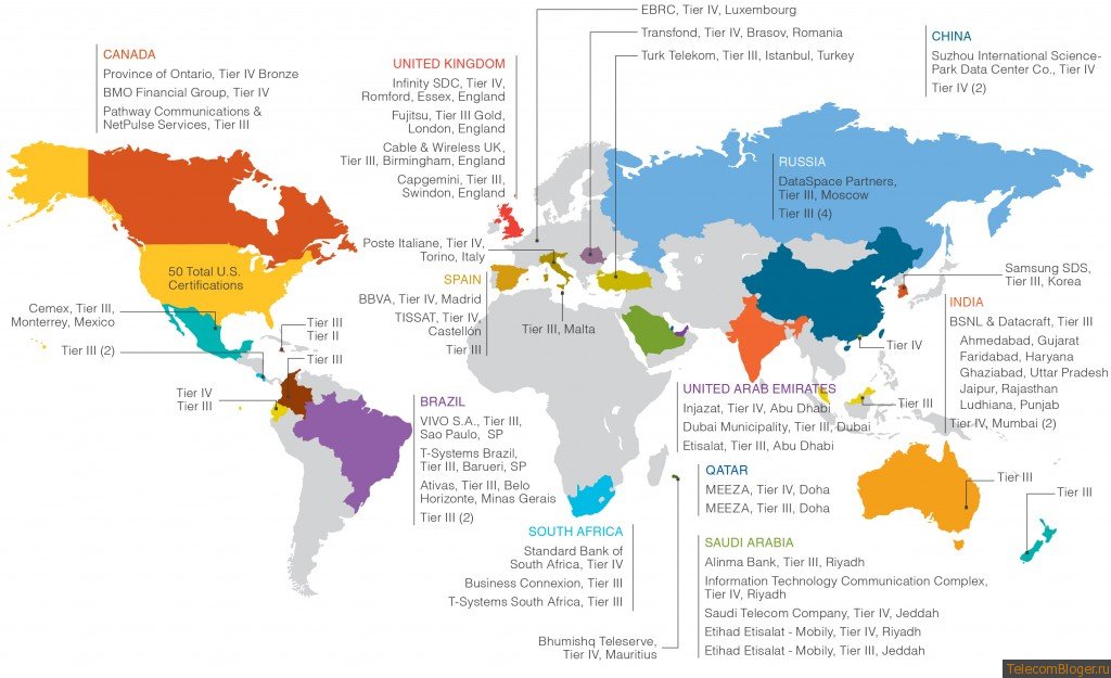 Вот так выглядит мир из Дата-Центров, получивших, тот или иной уровень отказоустойчивости от Uptime Institute. В России всего 4 сертифицированных ЦОД, им всем присвоен статус TIER III. На сайте института, указан только один уже прошедший сертификацию Дата-Центр DataSpace и еще три, пока в процессе получения.