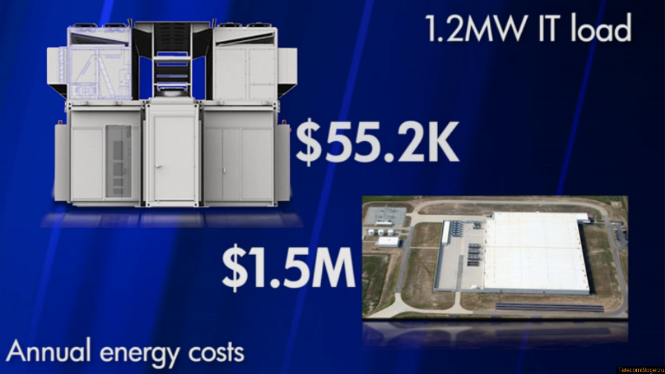 Решение обеспечивает среднюю плотность, мощностью 44кВт на стойку, с максимальной плотностью до 69кВт. «Это ЦОД, которые использует одну десятую площади», сказал Ganthier.