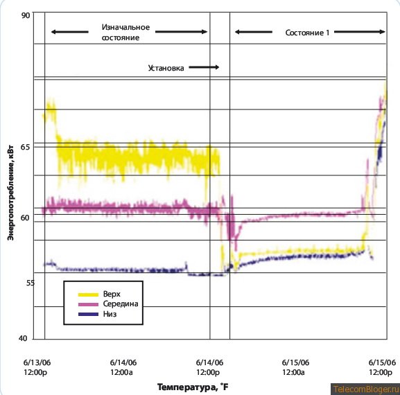 Первоначально температура возле стойки менялась от 10°C внизу до 24°C наверху. После оптимизации показания датчиков стали гораздо ближе: 10 и 16°C. Как показывает график, первоначальное состояние не отвечало стандартам ASHRAE, но организация холодных проходов исправила положение.