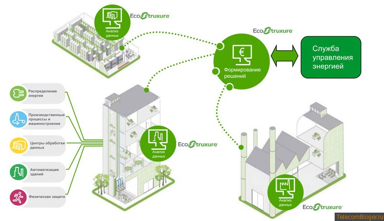 Системная архитектура активного управления энергией EcoStruxure компании Schneider Electric объединяет пять важнейших областей управления: управление электропитанием, технологическими процессами и оборудованием, центрами обработки данных, инфраструктурой зданий и системами обеспечения безопасности. Архитектура EcoStruxure использует открытые стандарты и позволяет экономить до 30% энергии.