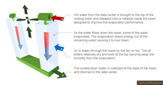Со слов Вейл, Google использует испарительные градирни в каждом центре обработки данных, включая свой новый дата-центр в Бельгии. Горячая вода подается к вершине градирни и спускается вниз через материал, который вызывает быстрое испарение. В течение периода охлаждения испарением, чиллеры для охлаждения ЦОД не используются, или используются не так часто.